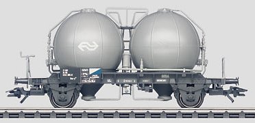 Prototype: Dutch State Railways (NS) type Ucs. Car with 2 containers, each with 17 cubic meters / 449 gallons (34 cubic meters / 898 gallons) capacity.