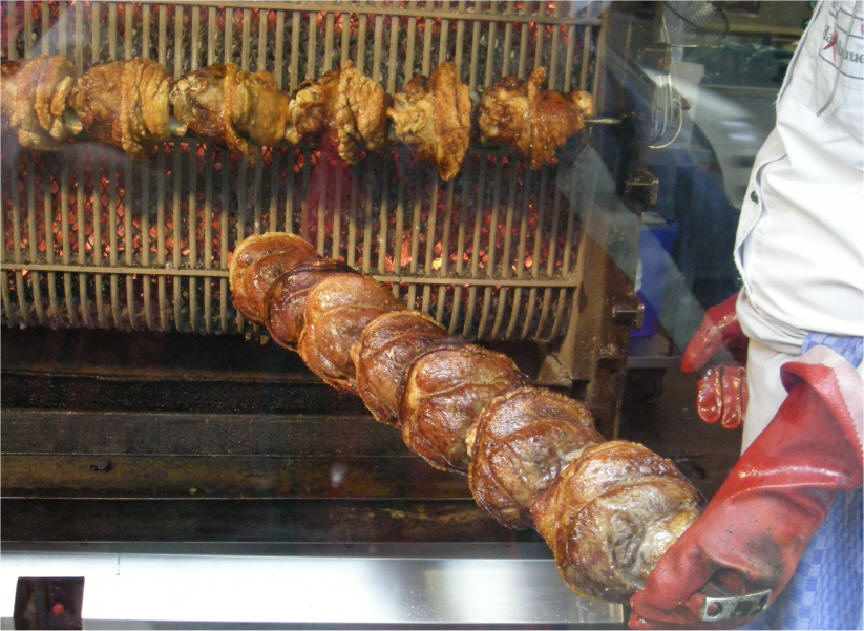 Here, the "chef" has just taken off one of the spits and is browning the end to