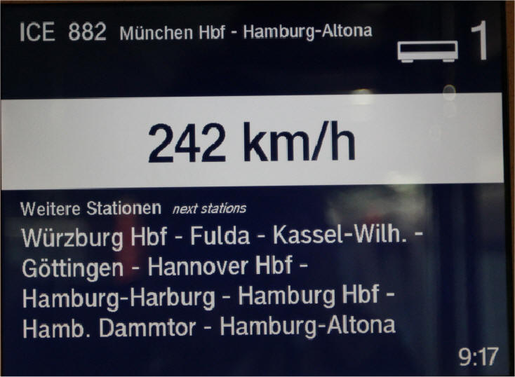 Some ICE trains go as fast as 300 km/hr. Ours topped-out at about 250 this day -- still pretty cool: