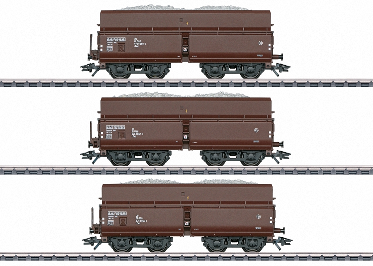 Model: Model: The container transport car has reproductions of high-performance buffers and separately applied grab irons. The container is removable. Stakes that can be installed on the car are included with the stake car. The sliding roof / sliding wall car has separately applied platforms at the ends. All of the cars are individually packaged and there is a master package. Total length over the buffers approximately 80.7 cm / 31-3/4". DC wheelset E700580.